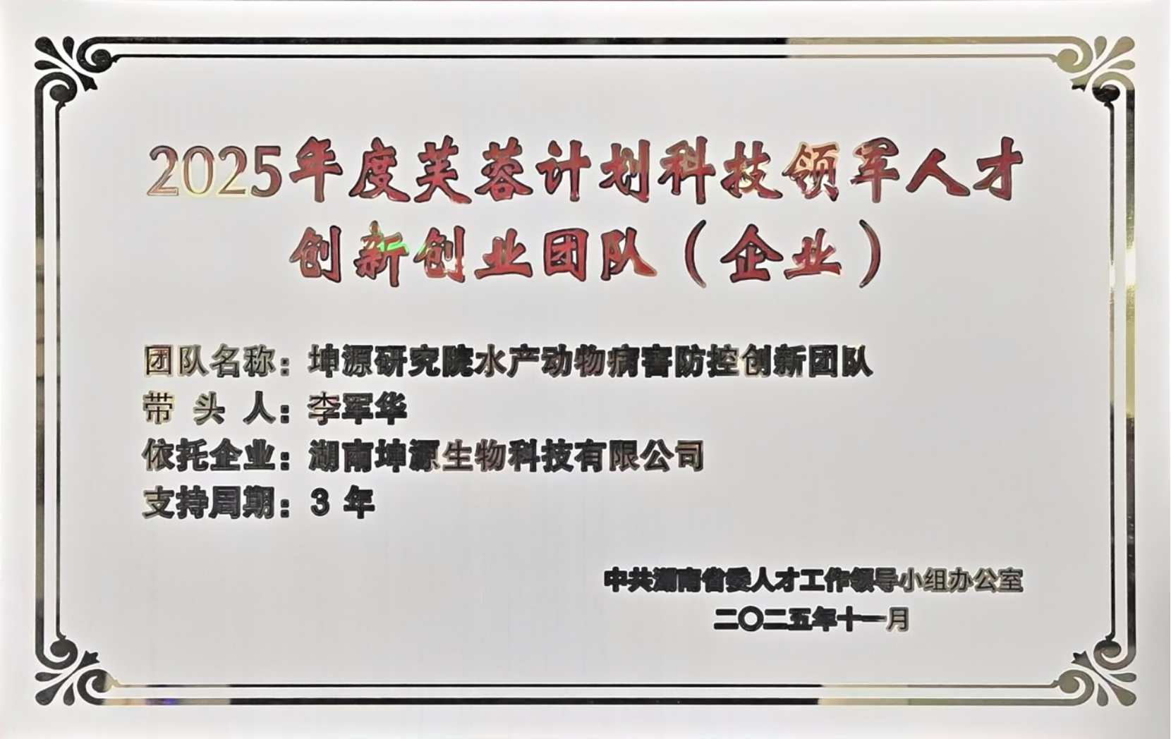 此外,公司科研团队与湖南坤源生物科技有限公司联合申报的“坤源研究院水产动物病害防控创新团队”成功获批2025 年度芙蓉计划科技领军人才创新创业团队立项。创新团队由公司李军华教授担任带头人,依托湖南坤源生物科技有限公司,将聚焦水产动物病害防控领域的关键技术瓶颈,开展疫病诊断、绿色防控、疫苗研发等方面的创新研究与成果转化工作。